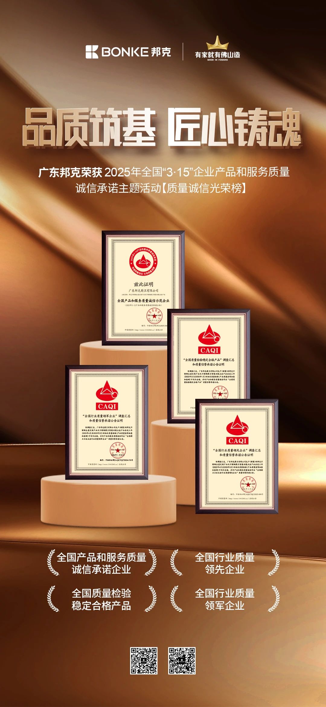 在 2025 年 "3?15" 國際消費者權益日,中國質量檢驗協會公布年度質量誠信榜單,專注不銹鋼家居定制的廣東邦克廚衛有限公司憑借穩定的產品品質與持續的誠信服務,斬獲 "全國產品和服務質量誠信承諾企業"、" 全國質量檢驗穩定合格產品 "、"全國行業質量領軍企業"、" 全國行業質量領先企業 " 四項殊榮。
