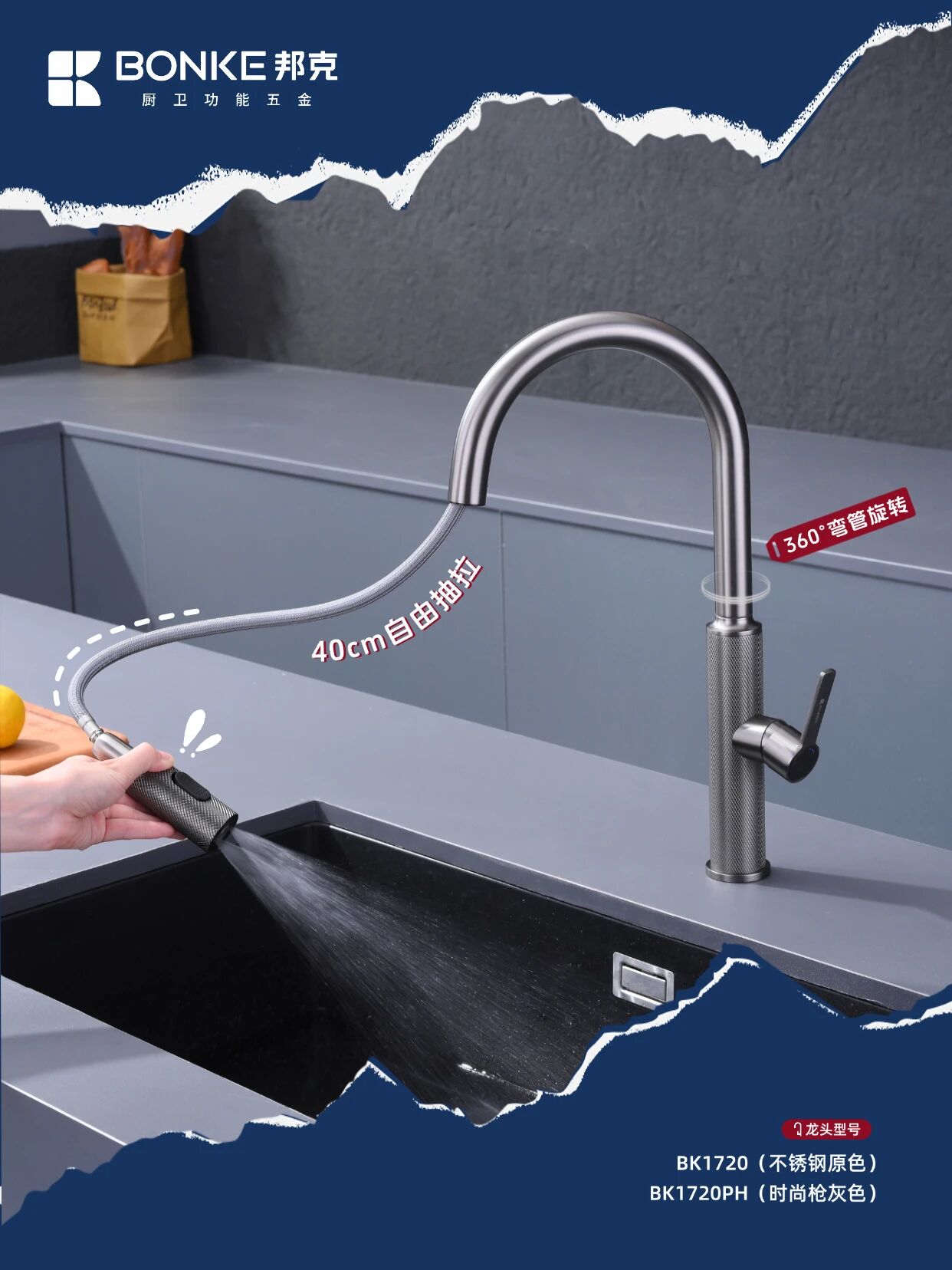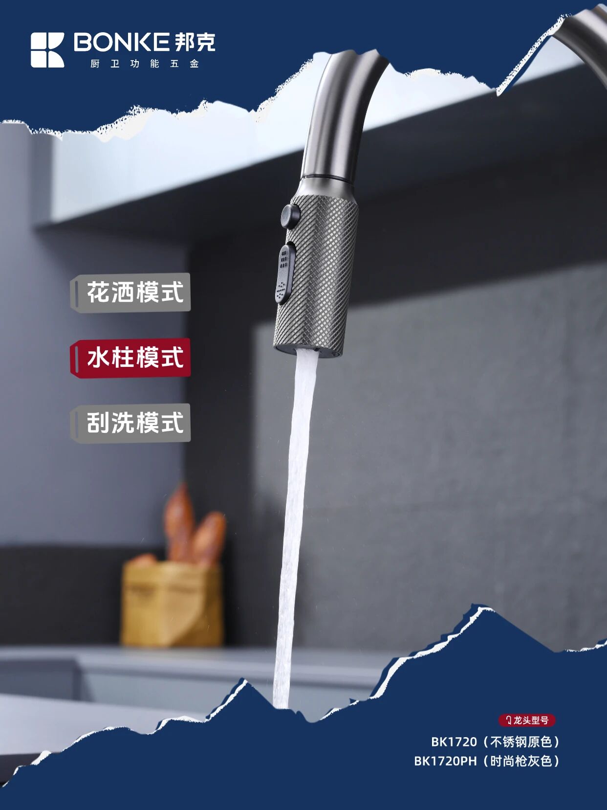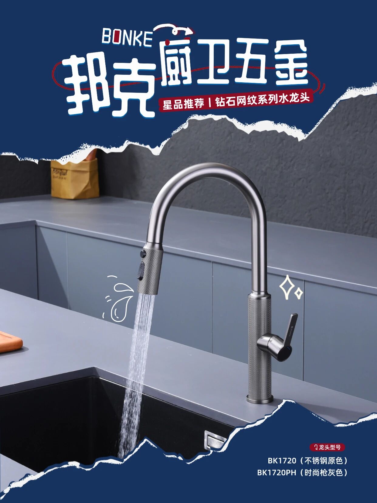 作為廚衛功能五金領域的創新之作?邦克鉆石網紋系列水龍頭——BK1720/BK1720PH以其卓越設計與實用功能?為現代廚房空間帶來全新升級體驗??顏值暴擊『鉆石網紋設計』?紋理設計高級感拉滿?裝在廚房瞬間提升整個空間的時尚度?不銹鋼原色和槍灰色兩種選擇??不管是簡約風還是輕奢風廚房都能完美適配?