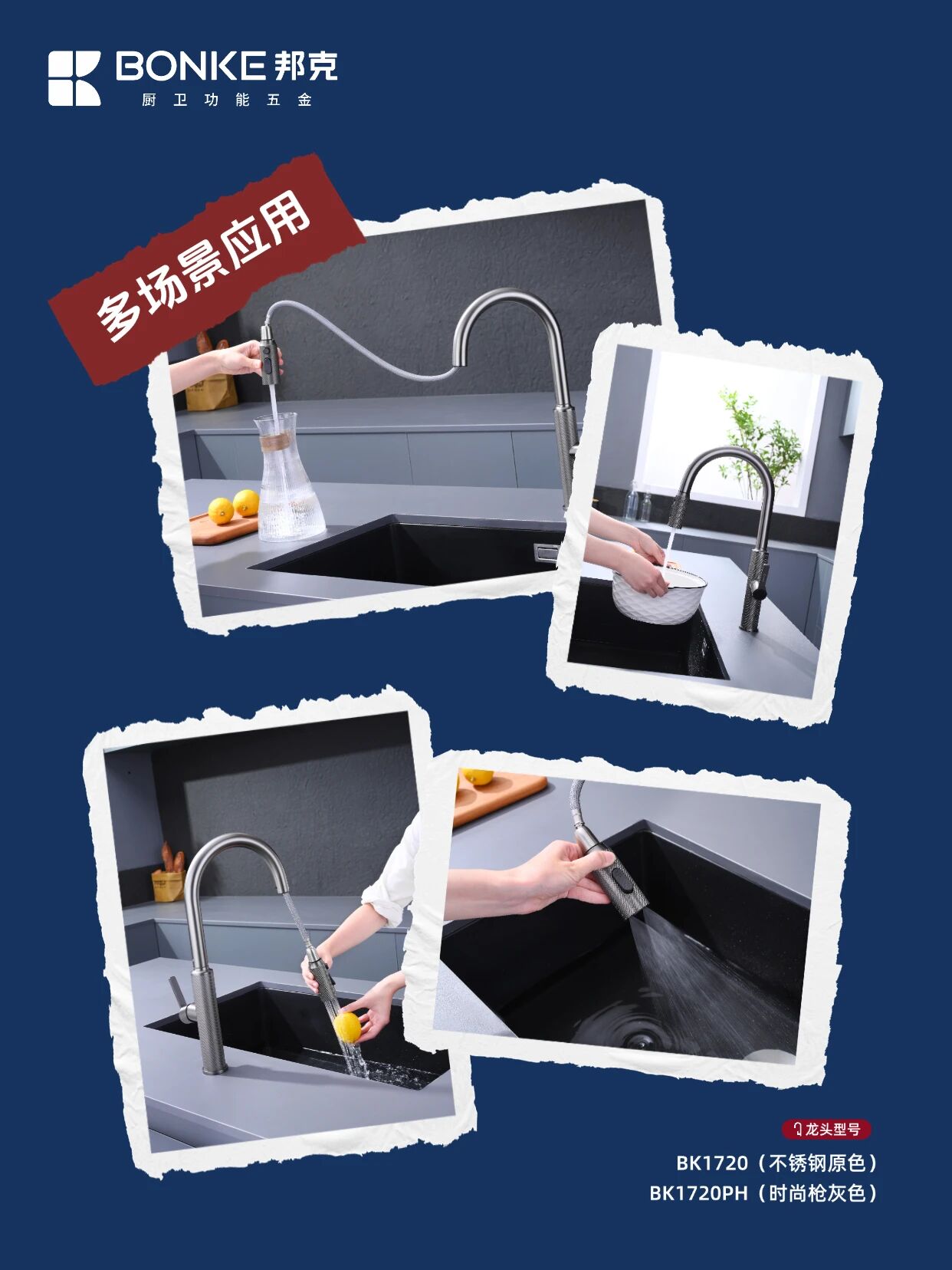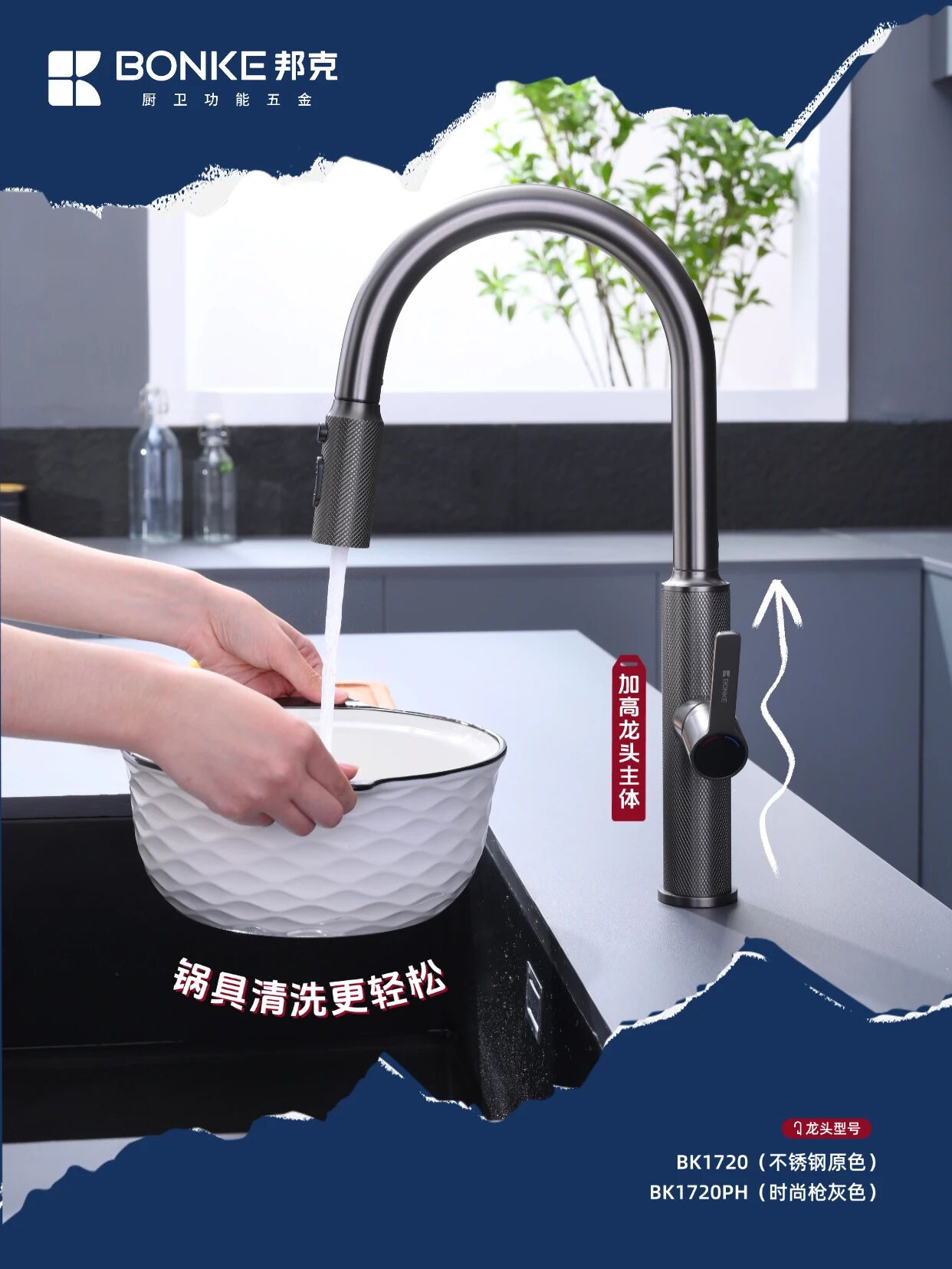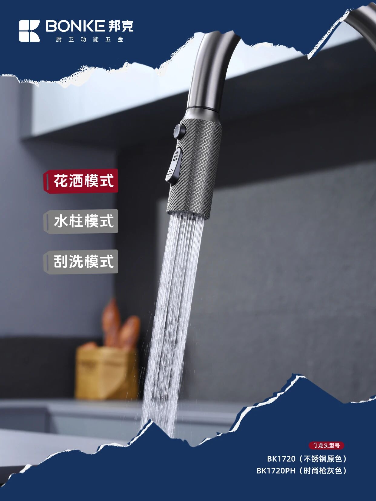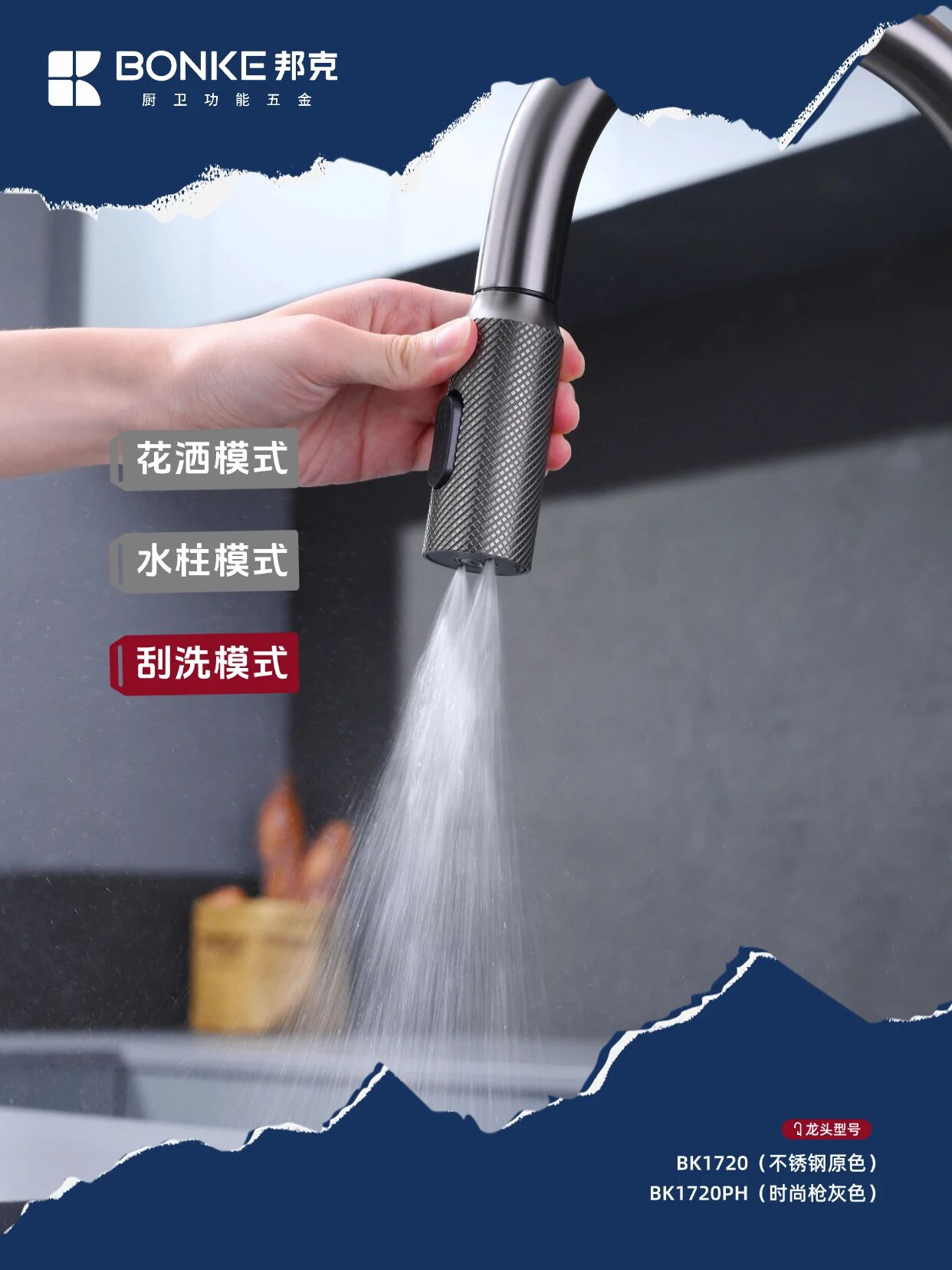 作為廚衛功能五金領域的創新之作?邦克鉆石網紋系列水龍頭——BK1720/BK1720PH以其卓越設計與實用功能?為現代廚房空間帶來全新升級體驗??顏值暴擊『鉆石網紋設計』?紋理設計高級感拉滿?裝在廚房瞬間提升整個空間的時尚度?不銹鋼原色和槍灰色兩種選擇??不管是簡約風還是輕奢風廚房都能完美適配?