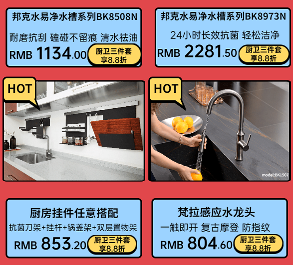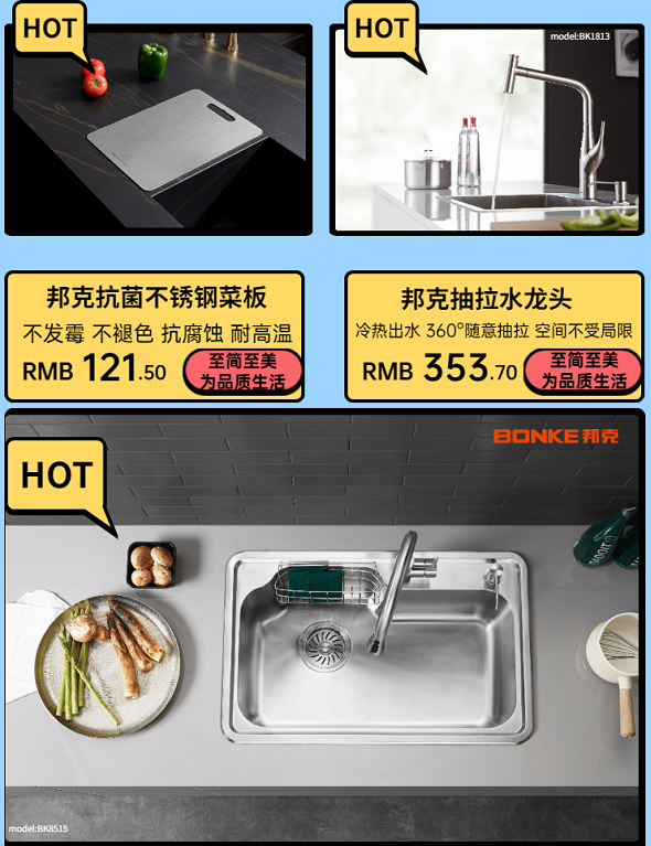 但是想要更好的好生活,沒那么貴! 一個好的不銹鋼水槽經久耐用 卻承載了許多一家人一輩子的記憶 廚房是一個特別重要的地方,我們裝修的每一處都要實用 健康的飲食習慣不僅僅是一種深耕文化 更是一種生活方式的體現,生活態度的踐行 別看水槽在廚房占不到1㎡ 要是選不對,每天做飯多痛苦半小時 要是選對了,可以愛上洗碗,連洗碗機都不需要了! 廚房和生活不可將就,一起下廚是幸福的開端 在考慮美觀、耐用、環保等因素時 健康與干凈在廚房是缺一不可的生活方式 井然有序是精致生活的高效訣竅 邦克廚衛是萬千家庭的走心之選