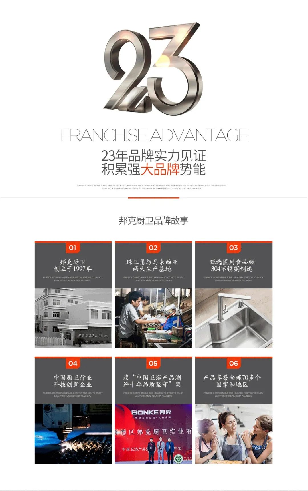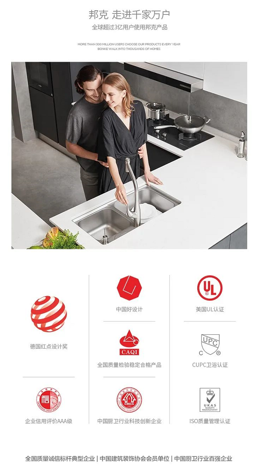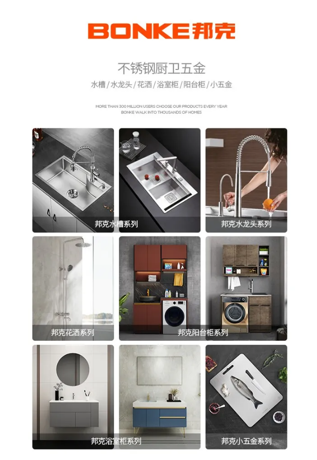 廣東邦克廚衛有限公司創立于1997年,坐落于廣東佛山,占地面積近10萬平方米,憑借著23年的深耕經驗、專業的營銷團隊和雄厚的生產實力,成為國內起步早、規模大、品種全、口碑佳的不銹鋼功能性、智能化全屋不銹鋼產品服務商!邦克公司旗下擁有邦克、可美家、凱蕾、名迪等多個品牌,產品涵蓋廚衛五金(水槽、水龍頭、沐浴花灑、掛件、小五金等)和不銹鋼全屋定制(櫥柜、衣柜、洗衣柜、浴室柜等)兩大系列品類。
