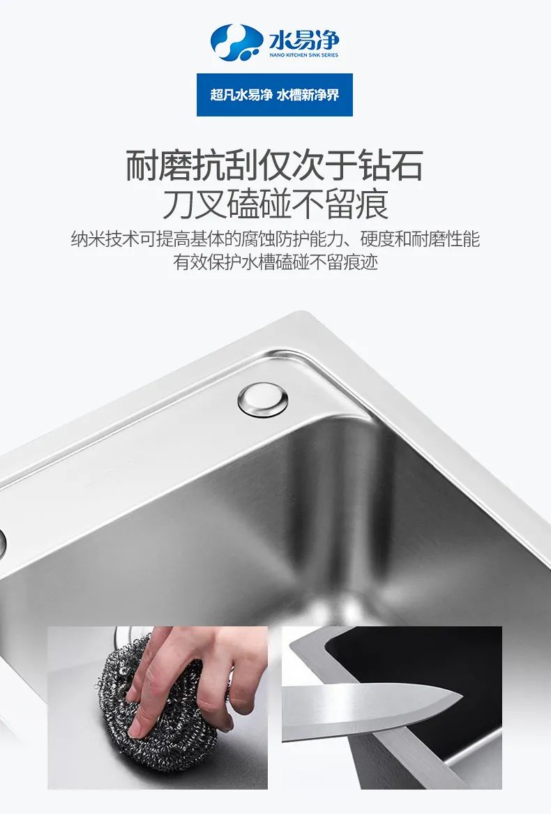 家用廚房水槽的清潔向來是消費者最煩惱的事,在油漬長期的”摧殘“下,被刮花或油漬斑斑沒清潔干凈,不僅難看還容易滋生更多細菌。針對消費者的使用痛點,邦克首創(chuàng)自潔凈水槽,把納米涂層技術(shù)運用在SUS304不銹鋼槽體上,能夠達到24小時長效抗菌,清水秒凈的效果,擊破家庭舊式水槽所存在的問題。