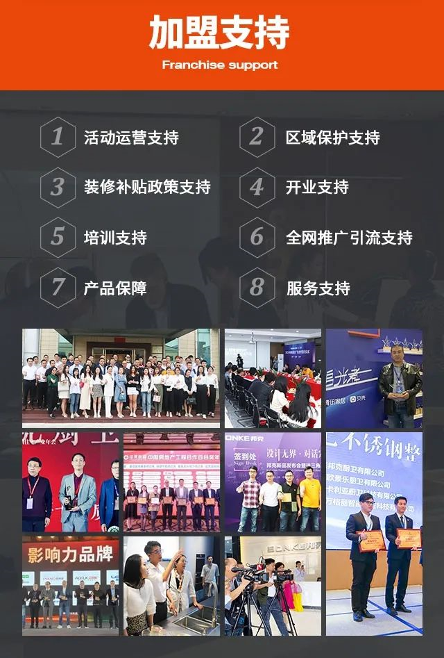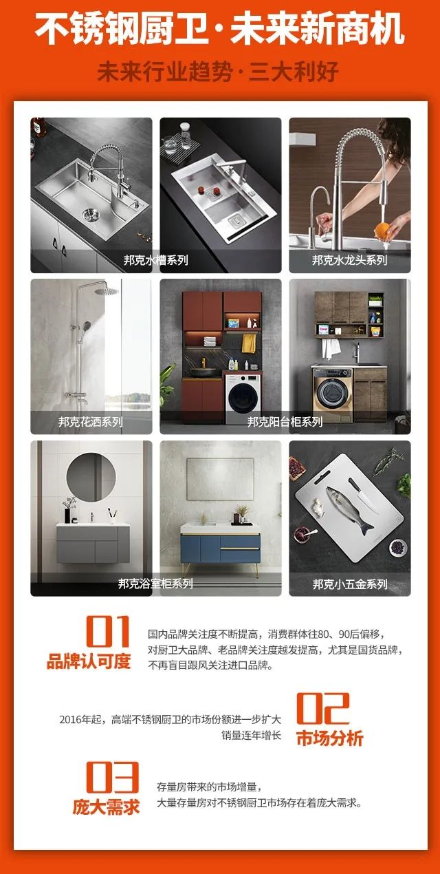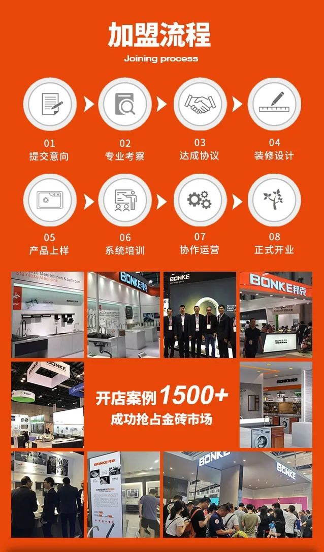邦克不斷滿足消費(fèi)群體80、90后的個性化需求,擴(kuò)大產(chǎn)品線,豐富產(chǎn)品系列涵蓋水槽、水龍頭、廚衛(wèi)掛件、花灑、陽臺柜、浴室柜、小五金等產(chǎn)品,最大程度滿足消費(fèi)者高品質(zhì)生活需求,能真正做到一站式購齊,為經(jīng)銷商帶來利潤最大化的效益,為經(jīng)銷商破格定制,升級幫扶政策,整店輸出,全方位保姆式開店幫扶政策,覆蓋全國99%的市場,從開業(yè)到盈利,為經(jīng)銷商保駕護(hù)航。