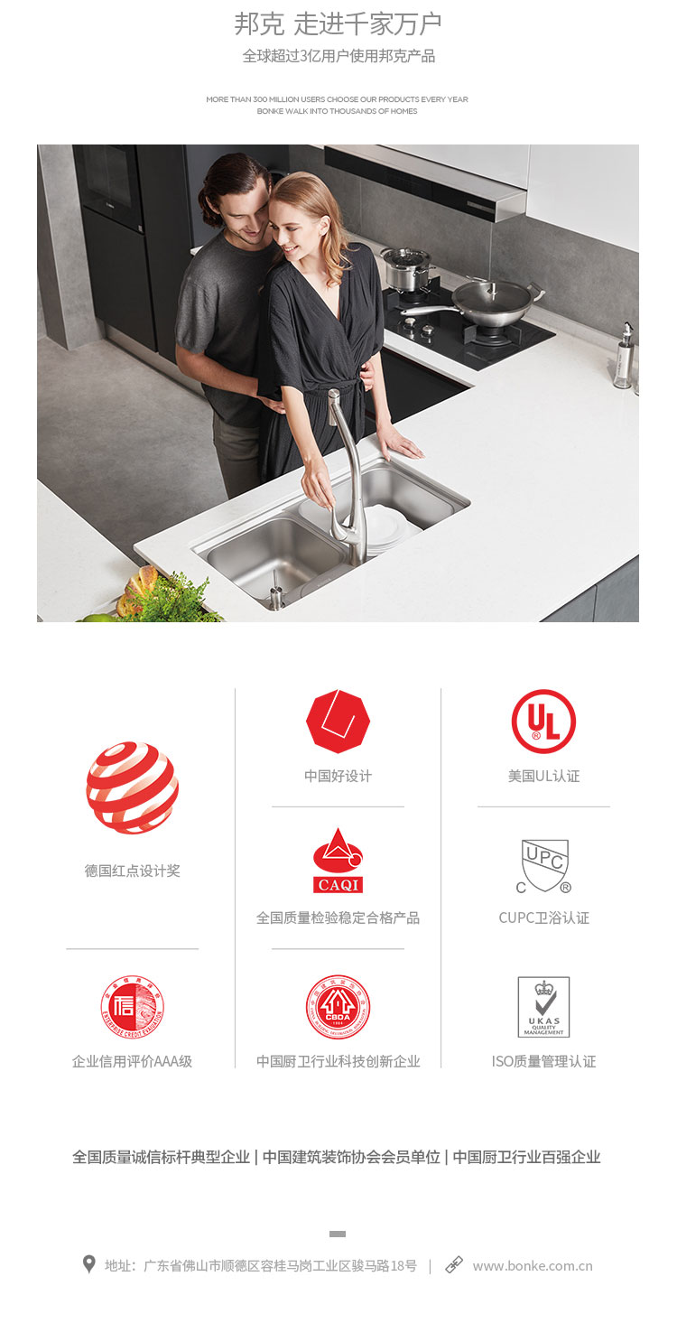邦克廚衛(wèi)深耕于不銹鋼行業(yè)近三十年,擁有三大生產(chǎn)基地、豐富的制造經(jīng)驗、先進(jìn)的生產(chǎn)技術(shù)和強大的研發(fā)團(tuán)隊,尤其是位于廣東佛山這個中國的不銹鋼之都,邦克擁有發(fā)展不銹鋼制品的天然優(yōu)勢,在不銹鋼材料的開發(fā)與運用方面常年居于業(yè)界前茅,擁有數(shù)十項獨家專利技術(shù),覆蓋包含不銹鋼水槽廚房龍頭陽臺柜浴室柜全屋定制等在內(nèi)的不銹鋼全品類產(chǎn)業(yè)鏈,產(chǎn)品遠(yuǎn)銷海內(nèi)外七十多個國家和地區(qū),以健康環(huán)保、經(jīng)久耐用等優(yōu)勢特性深受消費者的認(rèn)可和喜愛。