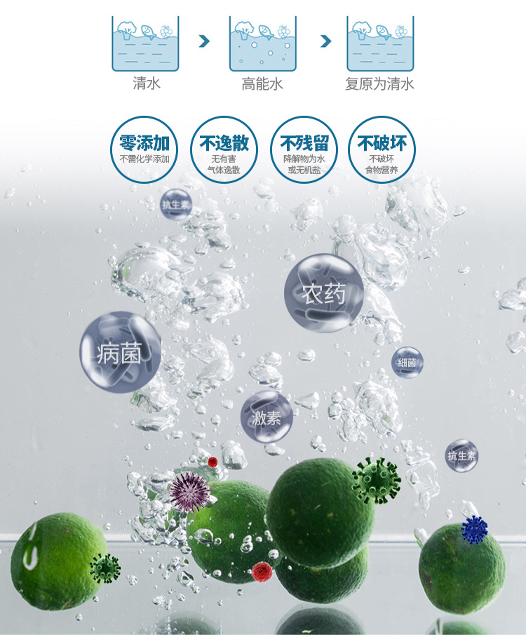 果蔬中的農殘、肉類水產海鮮中的污染也不能掉以輕心!水觸媒高能團可分解農殘、細菌的化學鍵,降解為水、二氧化碳和無機鹽,從而使食材解毒更徹底,吃得更放心和健康。