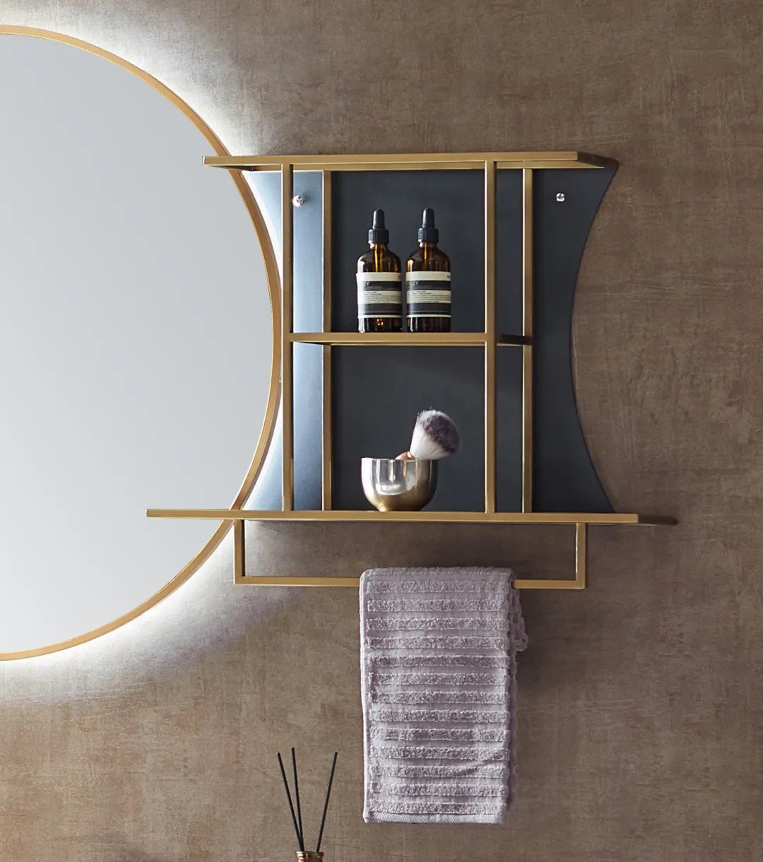 采用輕奢金色的鐵藝架子搭配智能鏡子,