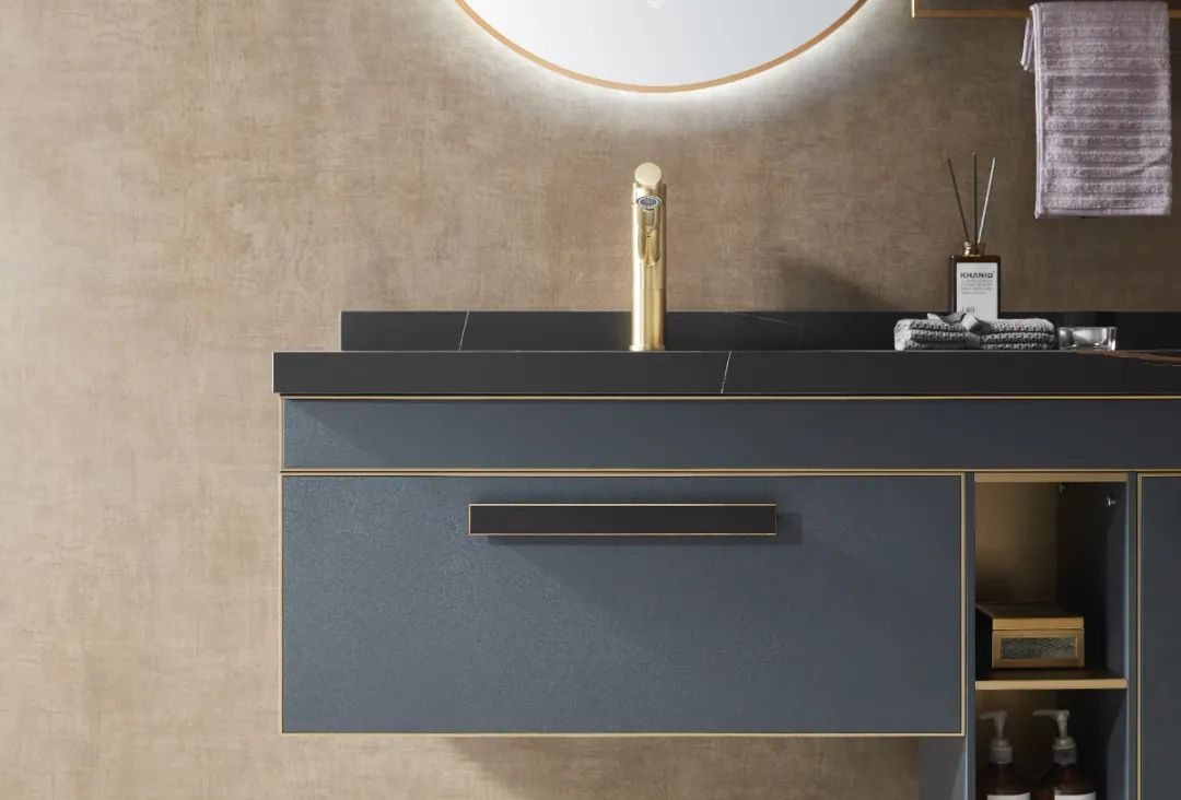 這款輕奢·榮耀系列的不銹鋼浴室柜,卻讓人一眼驚艷。整體采用深海藍色和金屬的絕妙搭配,純粹清爽與沉穩雅致相得益彰。并且,細節處理得十分精致,點睛之筆的金色元素,增添了空間的藝術之美與高品質之感。