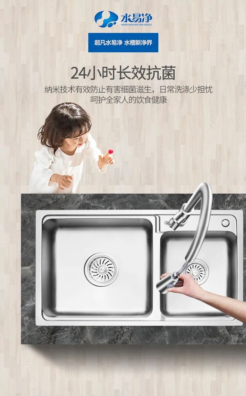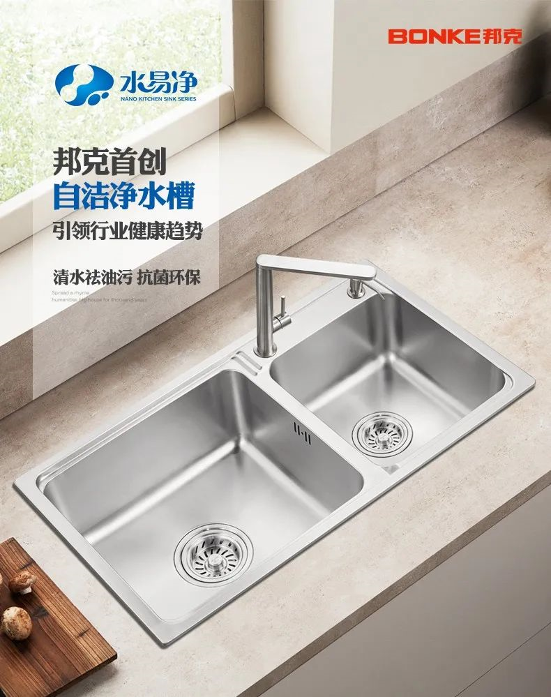 水易凈納米水槽,具有超強的抗菌抗油功能及優(yōu)異防污效果使家庭廚房的日常清潔維護變得簡單方便。邦克水易凈納米水槽懂廚房,更懂你,新家配好槽,省心省空間。