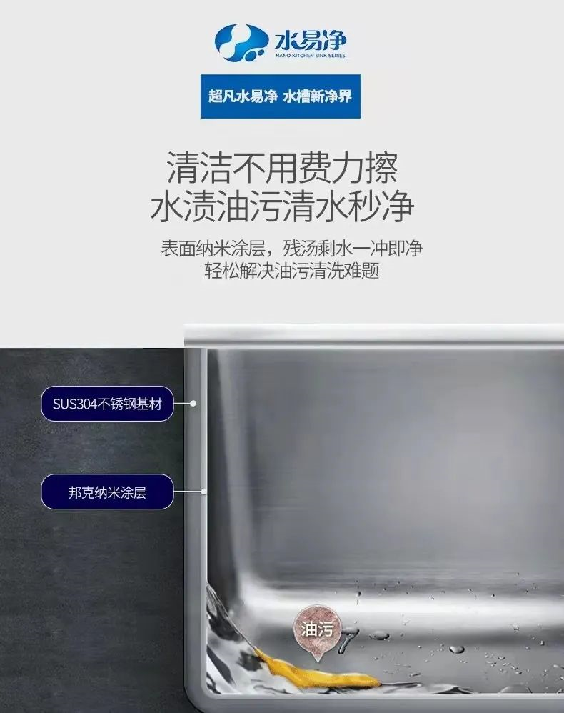 水易凈納米水槽區(qū)別于常規(guī)的不銹鋼水槽,通過在304不銹鋼槽體表面覆蓋六層納米高分子無機復(fù)合抗菌新材料,利用其極佳的親水性能,當(dāng)水接觸槽面后呈灘狀,迅速滲入涂層與油污的縫隙,油污浮起被水沖走,不會有任何殘留,達到抑菌抗菌的效果。