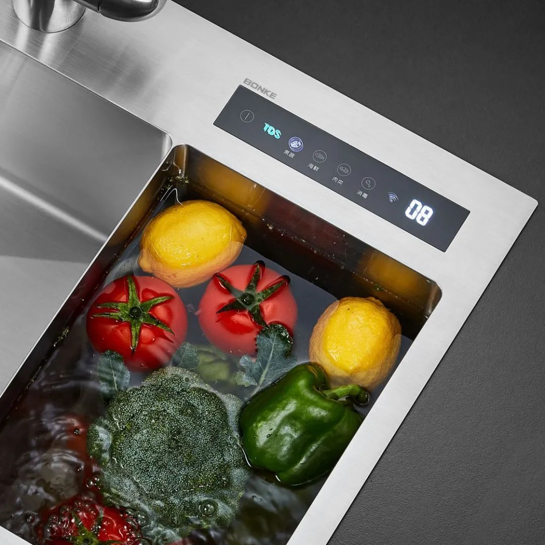 邦克水觸媒智能凈化水槽,引領家居生活進入智能凈化時代。通過核心部件降解農藥、激素、抗生素等化學殘留,殺滅生鮮食材表面的細菌、病毒等微生物,現代生活解放雙手更省空間。水槽凈洗二合一,兩大廚房功能,只占一個位置,享受雙重滿足。