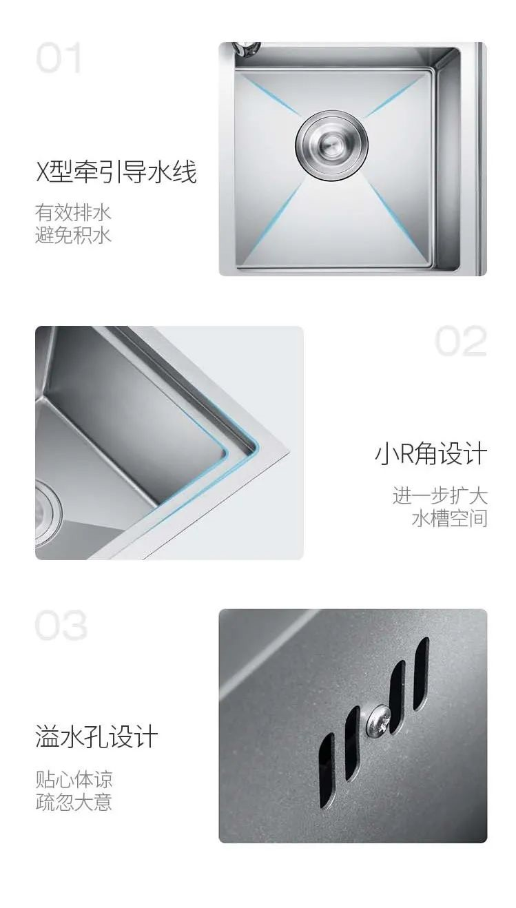 X型牽引導水線,避免積水引起細菌滋生的問題,不會有水漬殘留,使用后不用每次擦拭;小R角設計,更具顏值,同時進一步擴大空間,整個不銹鋼水槽空間利用率上也更高;溢水孔設計,限制水流高度,以免“水漫金山”。