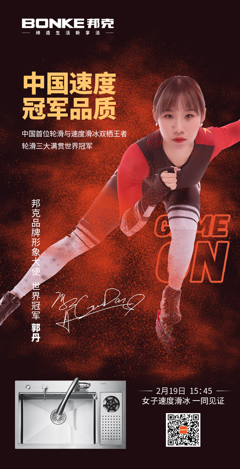 近日,廣東邦克廚衛有限公司正式官宣輪滑世界冠軍郭丹簽約,正式由郭丹擔任邦克品牌形象大使。邦克攜手世界冠軍郭丹一起“奔赴”新的征程,這不僅是邦克在品牌戰略之路上的新高度與突破,更是世界冠軍郭丹對邦克的高度認可!