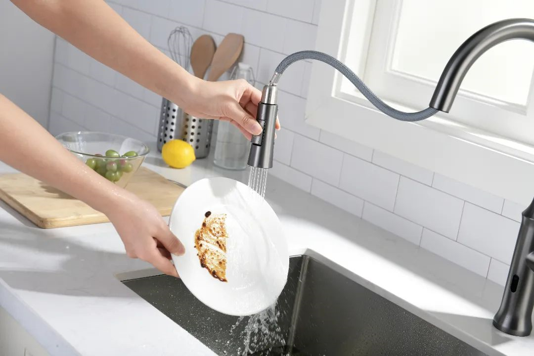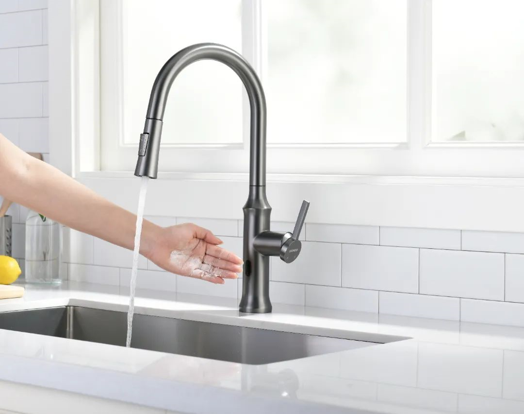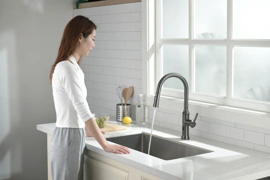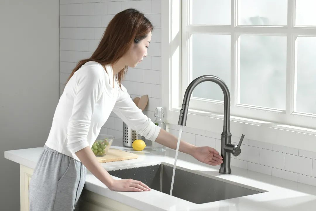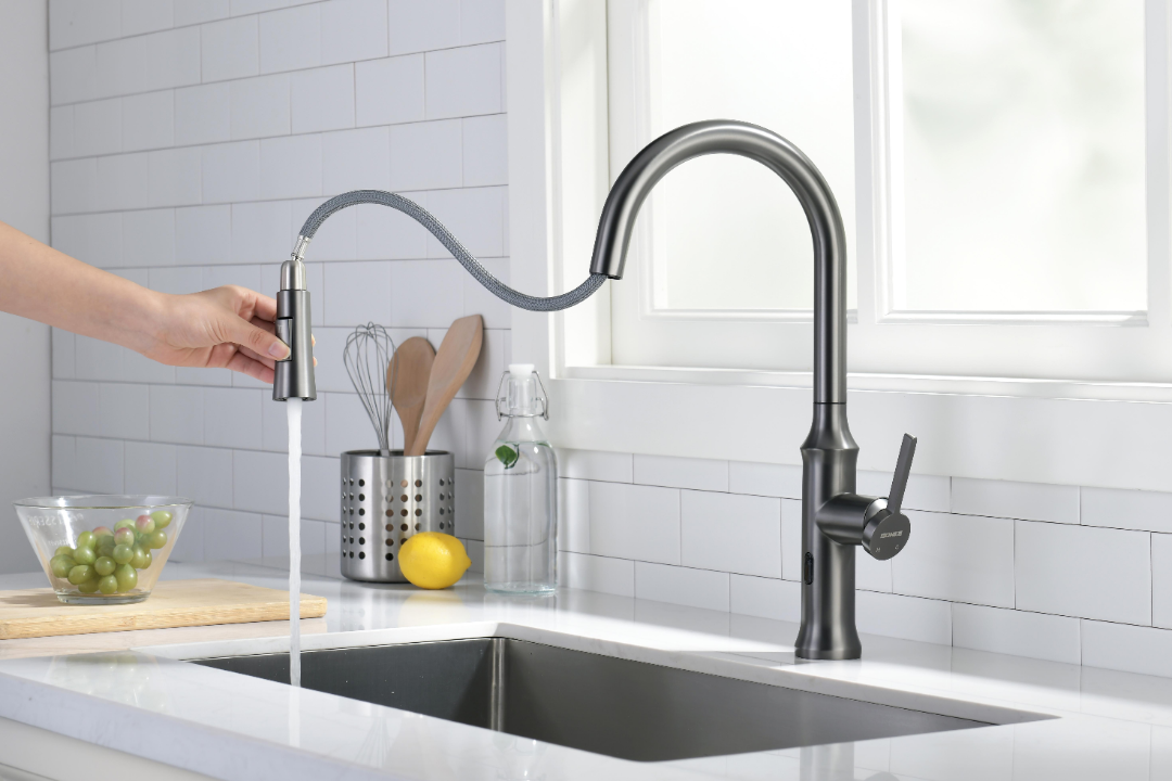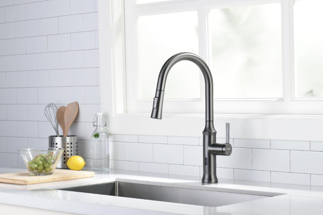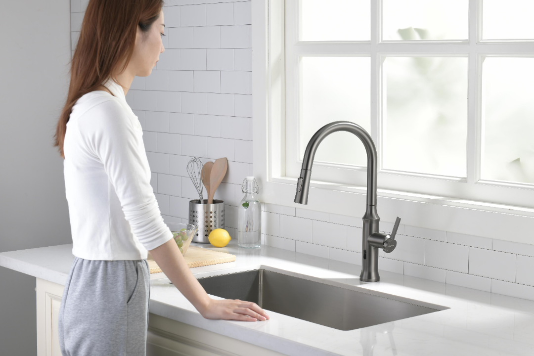 全新技術升級丨BK1907-7 01 語音控制 在開啟龍頭通電工作中,通過語音說出 “開水”或”關水”的普通話詞語或者英文 “OPEN” 和 “CLOSE”,可以開關電磁閥,實現開關水。 通過語音定義出水量功能,可提供一杯水,一盆水兩種定量出水,達到一定用水量時通過語音“關水”即可。 02 紅外感應 通過用手在距離感應窗口50mm范圍內遮擋,實現紅外感應控制開關水。精準感應,解放雙手。 在通過語音呼喚、紅外感應進行控制水流開關,避免手粘有面粉或雙手油膩等物質污染龍頭,造成清洗不便。當水龍頭忘關水離開時,控制閥3分鐘后準時自動關閉,有助于節約用水。 出水方式 龍頭出水方式分為花灑式出水和水柱型出水,通過自身的需求來切換開關從而實現出水的方式。高壓出水清潔,抽拉式設計360°無死角清洗,滿足不同的清潔需求。 精致外觀 食品級304原材,通過精細拉絲技術結合槍灰表面著色,低調但不失奢華,搭配各種家居風格,賦予生活更高的舒適與尊崇。簡約而大氣,讓清洗變得賞心悅目。 智美結合,任水流動。將產品做到極致,讓生活更有品質和內涵,給予你全新的廚房精致體驗。邦克從美學出發,用心創造生活,暢享廚房洗滌之美。