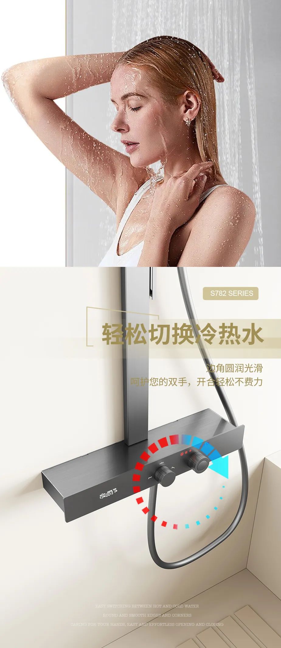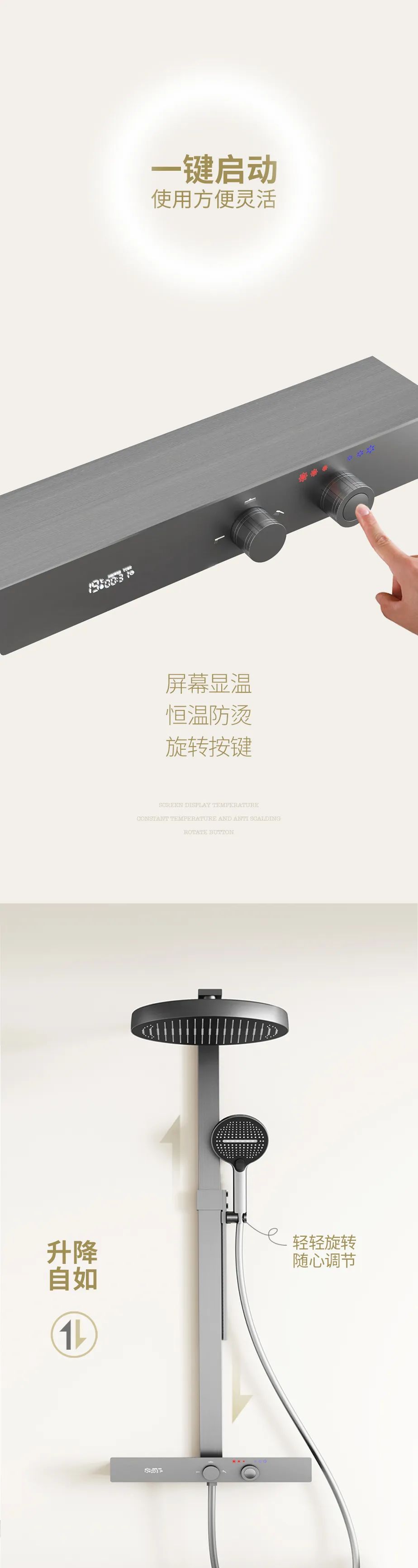 其他標準:  304不銹鋼殼、一體鑄造銅閥體、13寸花灑頂嘖、采用液態硅膠出水咀、三功能花灑加噴槍功能、瀑布下出水、全銅雙手輪、帶數顯LED燈水力發電